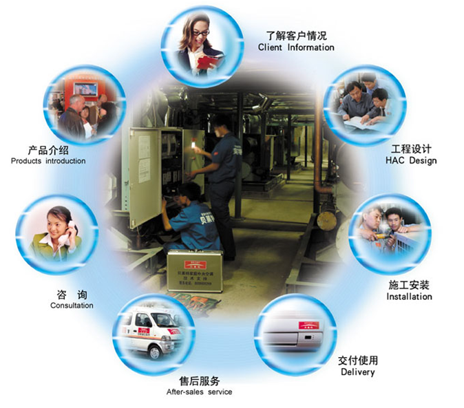 圖紙會審,技術(shù)交底,人力組織,機具進廠,每個環(huán)節(jié)都一絲不茍,精益求精。設(shè)備的安裝位置是否準(zhǔn)確,基礎(chǔ)是否符合設(shè)計要求,公司有專業(yè)技術(shù)人員親自監(jiān)督,確認(rèn)無誤方可開工。在每個制冷季和每個采暖季開始前,服務(wù)站點對所屬區(qū)域的每臺機組進行巡檢,以確保每一臺機器屆時正常工作。